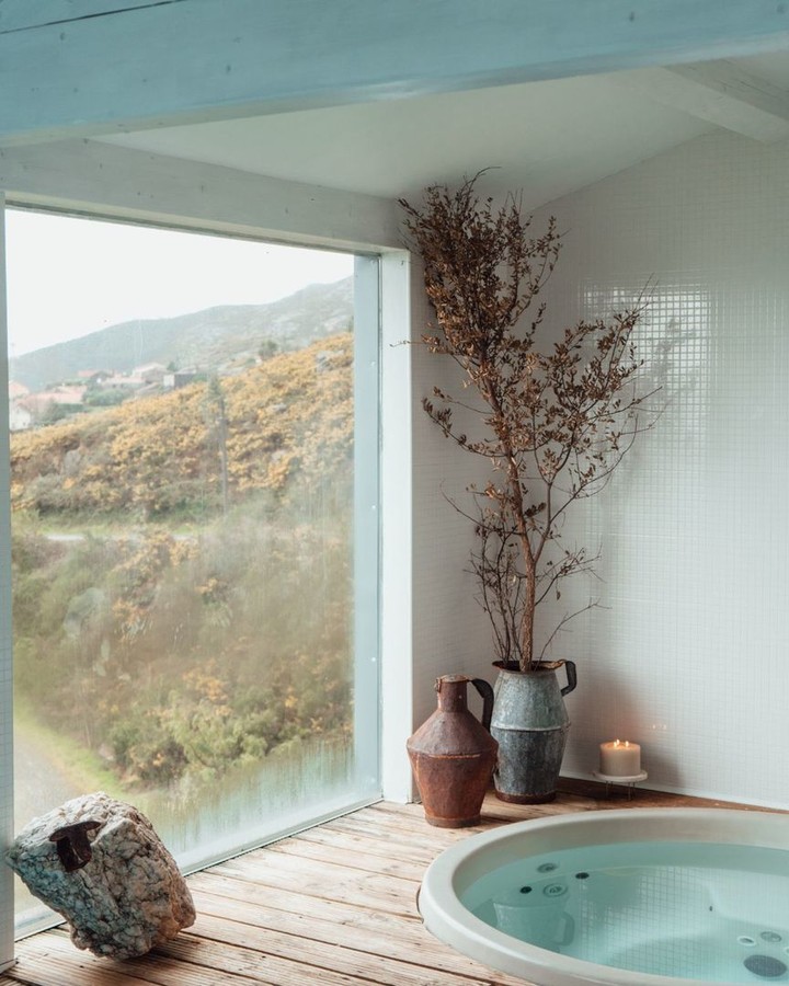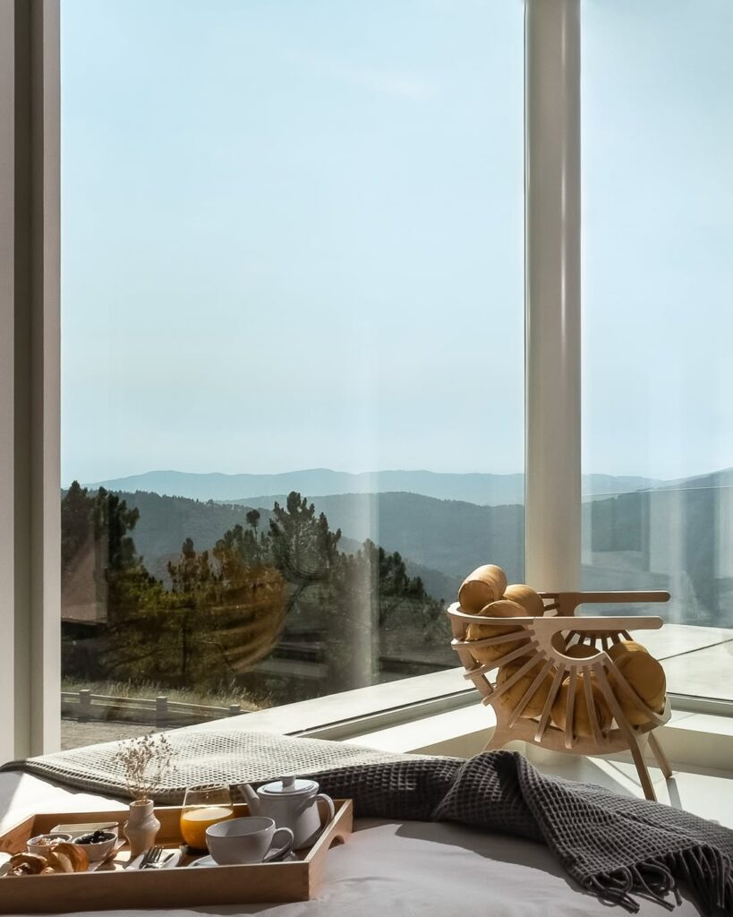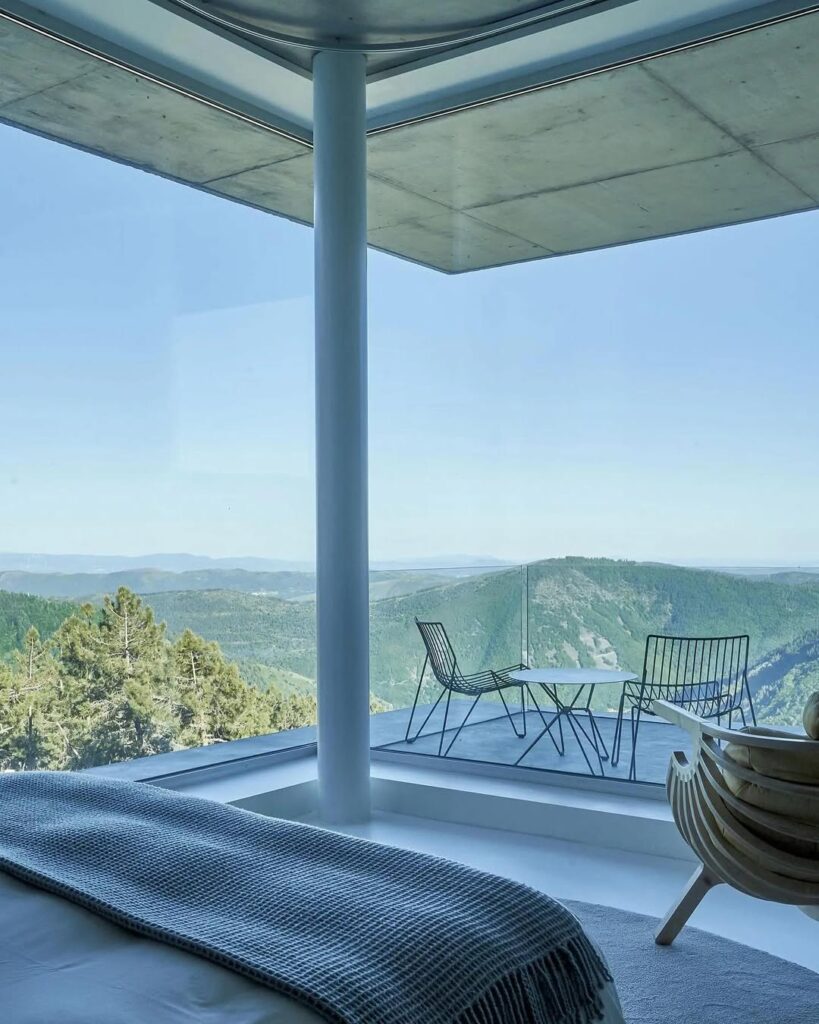 Situada a 1.250 metros de altitude, na Serra da Estrela, a Casa de São Lourenço destaca-se pela forma como os quartos se abrem totalmente para a paisagem da montanha. Todos virados a sul, funcionam quase como miradouros privados, onde o desenho contemporâneo e o uso do burel criam uma identidade muito própria. Os interiores são contidos, quentes e silenciosos, pensados para acompanhar o exterior sem competir com ele, especialmente marcantes nos meses mais frios.