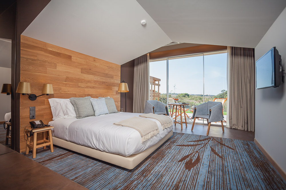 Entre a Bairrada e o litoral centro, o Vale d’Azenha apresenta quartos amplos, luminosos e bem estruturados, com uma abordagem contemporânea e funcional. As suites destacam-se pelas varandas, pelas banheiras generosas e pela relação fluida entre interior e exterior. É um hotel pensado para o conforto prolongado, onde o quarto assume um papel central na experiência, seja para descansar, ler ou simplesmente ficar.